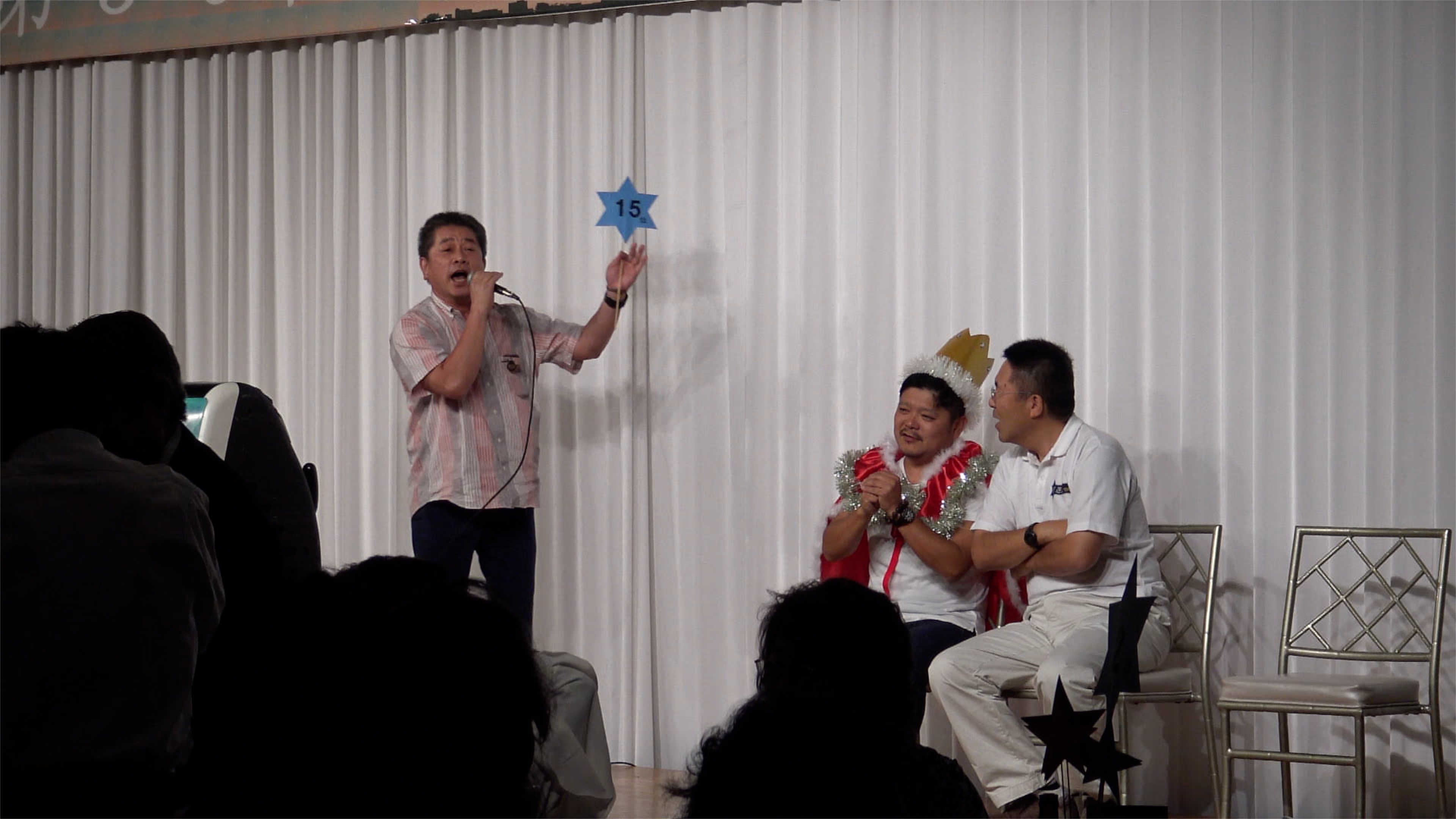 会の中盤、例年のごとく各回生の代表で二次会費用争奪ゲームですが、選抜チームでカラオケ対戦。