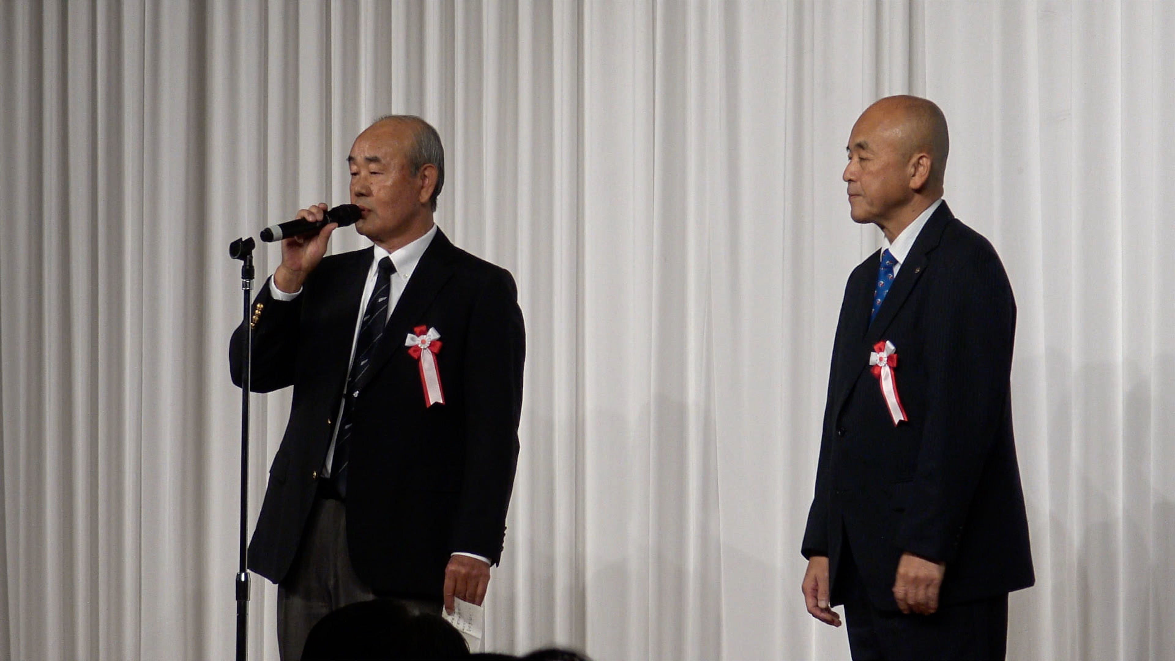 今回、総会において会長の交代がありました。岸上会長、そして新会長の野中会長のご挨拶です。