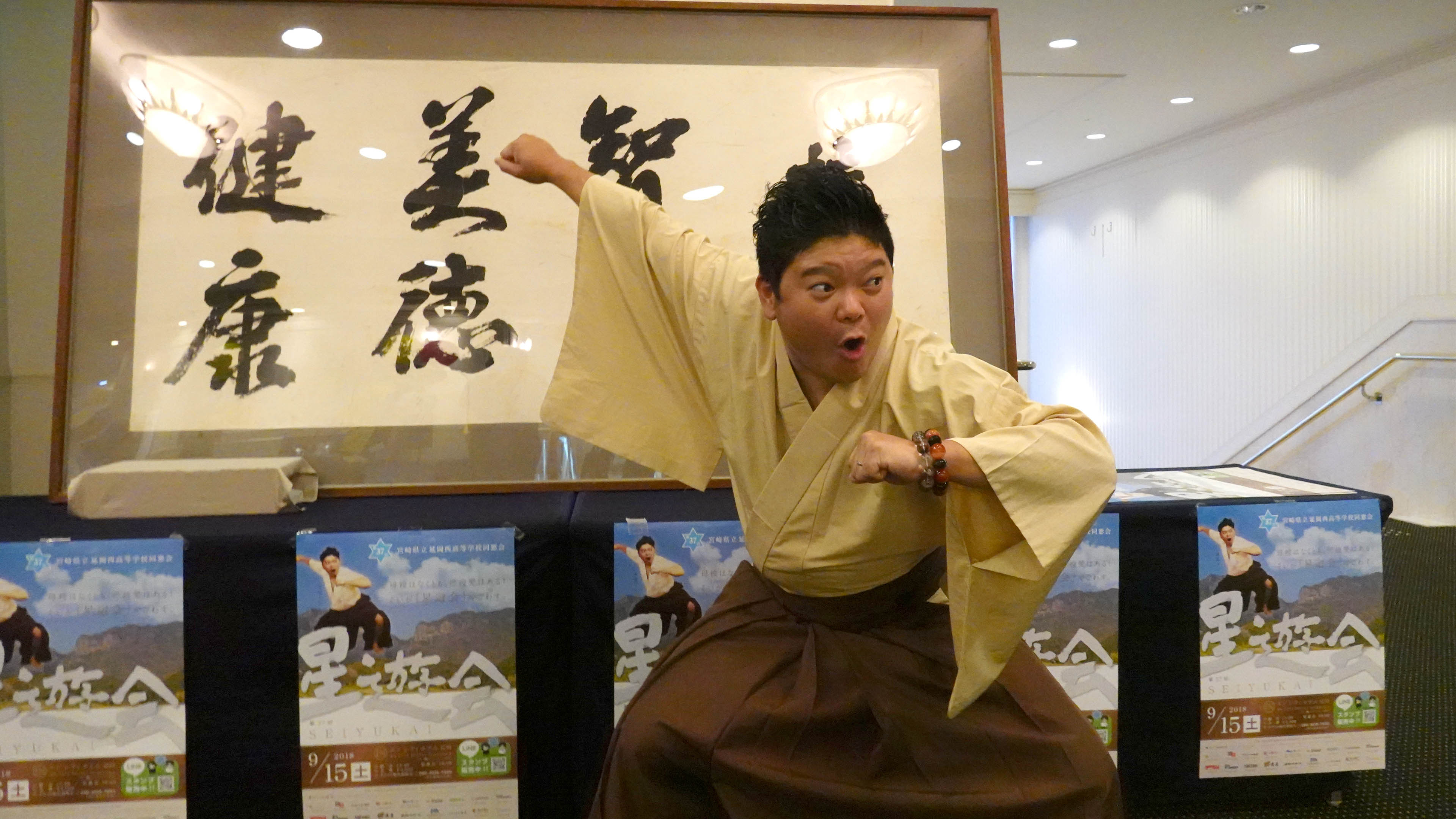 今年の大河ドラマ西郷どんをオマージュしたポスターのコピーが“母校はなくとも、母校愛はある! そいが「星遊会」でごわす。”ごらんのとおりモデルにポーズをとってもらいました。